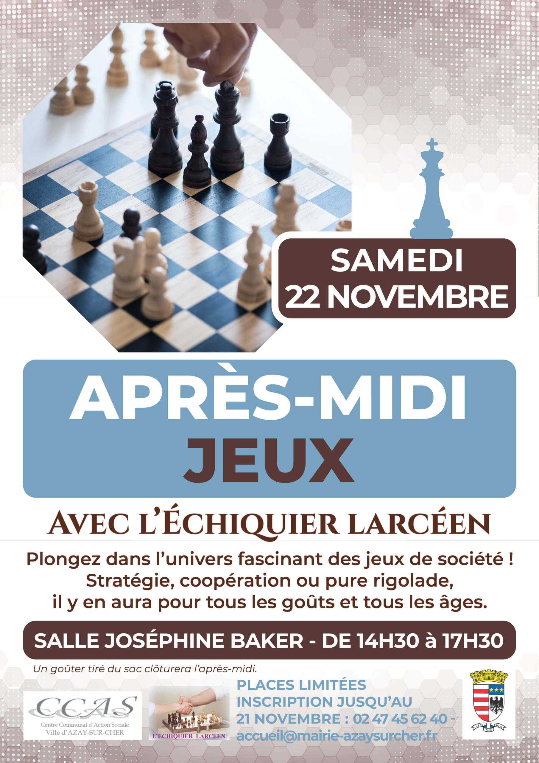 Le Centre communal d’action sociale (CCAS) d’Azay-sur-Cher vous invite à un après-midi convivial autour des jeux de plateau et de cartes, le samedi 22 novembre, de 14h30 à 17h30, à la salle Joséphine Baker (6 rue de Plaisance).
