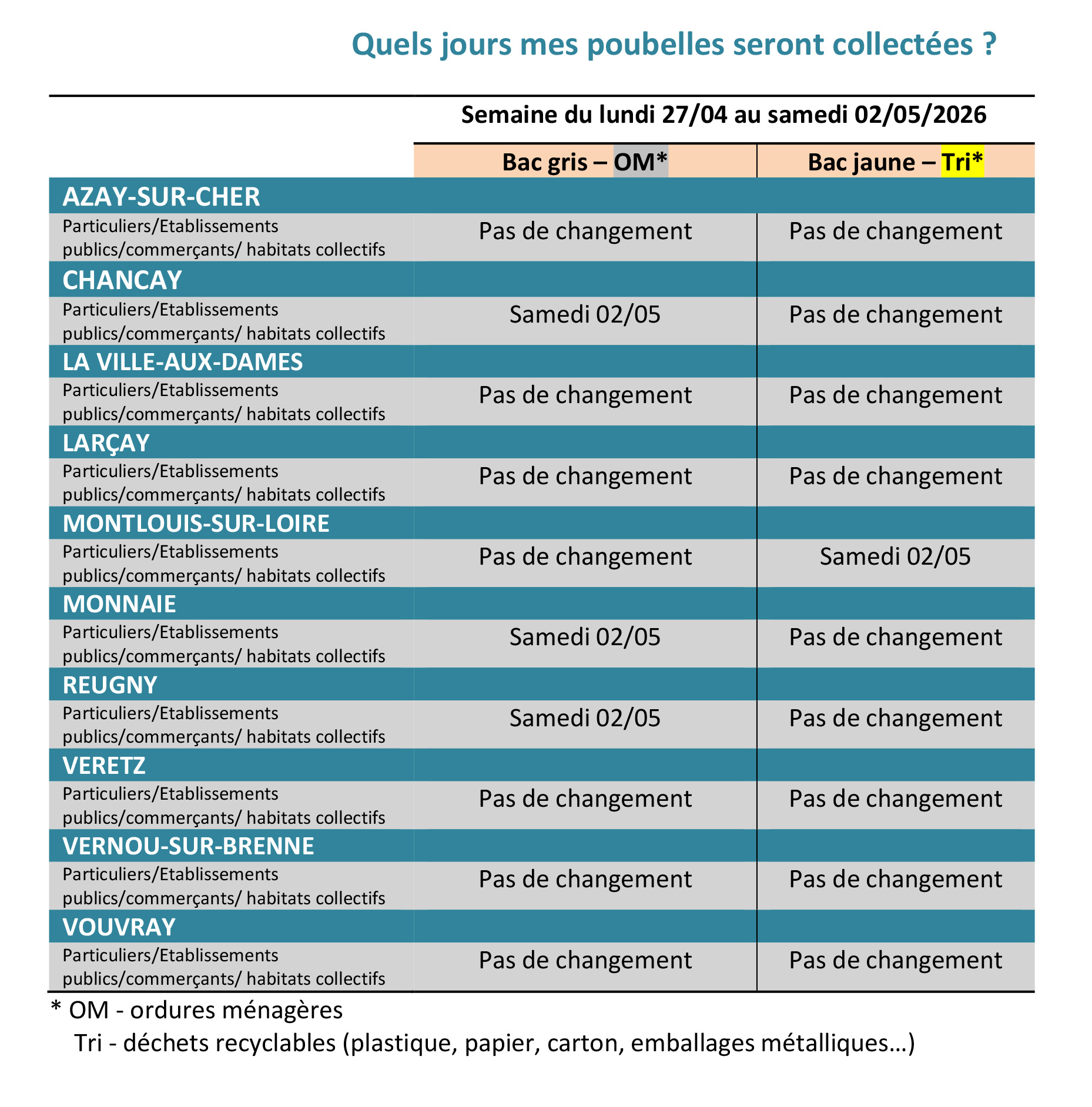 - Collectes des déchets ménagers (bac gris) lundis 27 avril et 4 mai