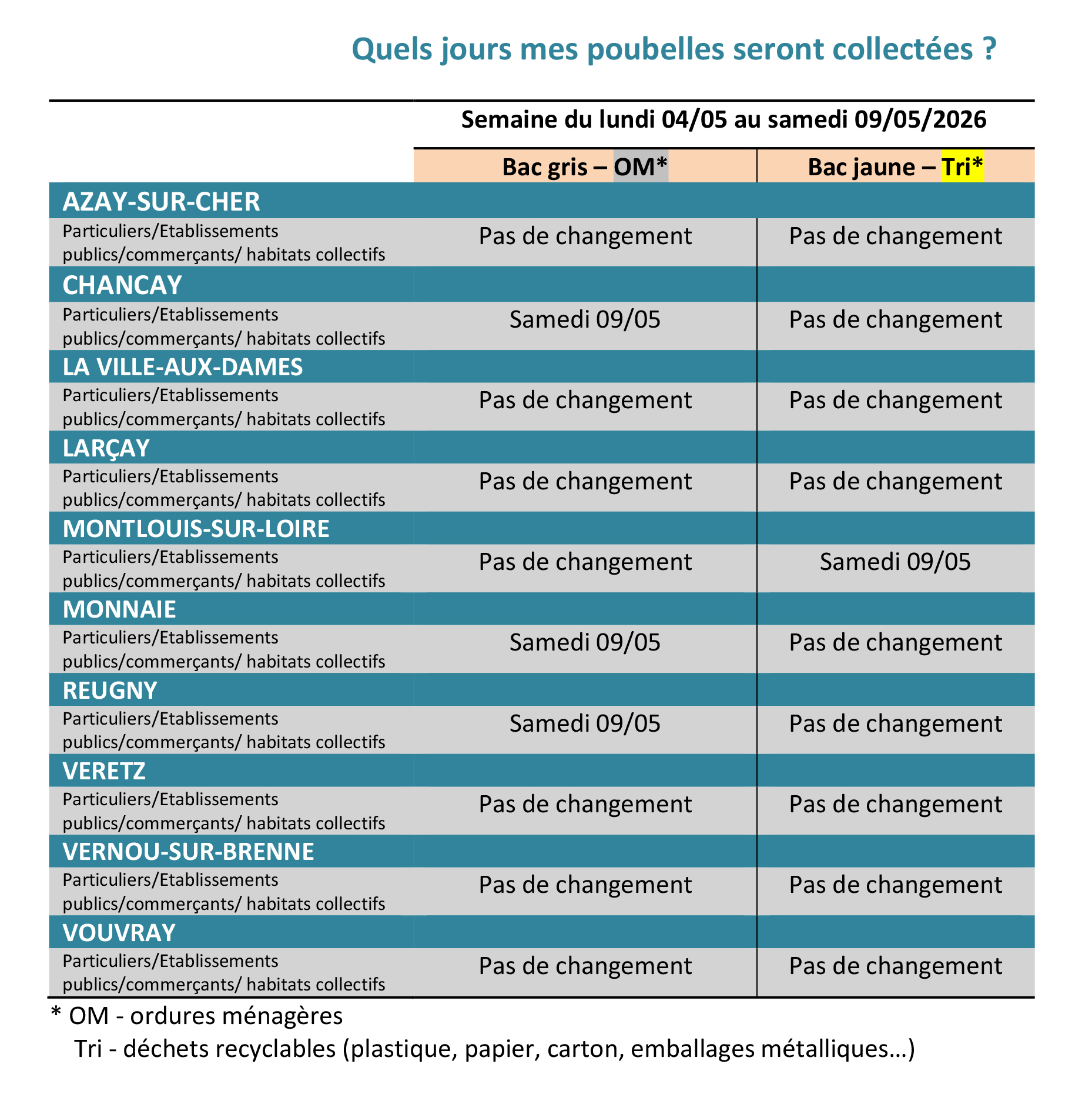 À l’approche des 1er et 8 mai, jours fériés, la Communauté de communes Touraine-Est Vallées vous informe que pour la commune d’Azay-sur Cher, les collectes des déchets ménagers et du tri sélectif sont maintenues aux jours habituels :