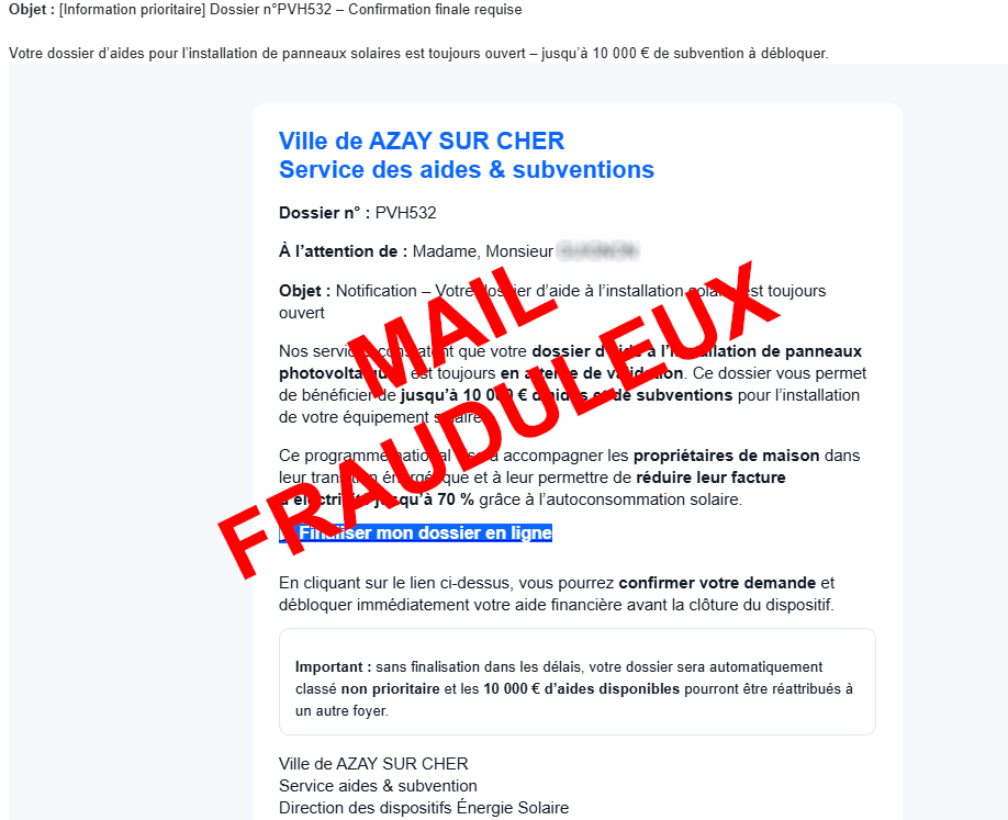 La mairie d’Azay-sur-Cher a été informée que plusieurs habitants ont récemment reçu un mail frauduleux se présentant comme une offre d’aides financières pour l’installation de panneaux solaires.
