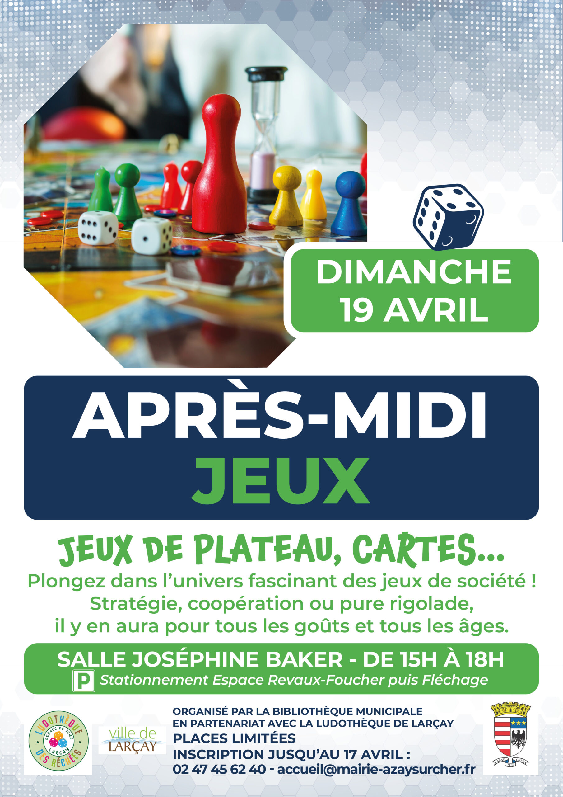 La bibliothèque municipale d’Azay-sur-Cher, en partenariat avec la ludothèque de Larçay, vous propose un après-midi jeux le dimanche 19 avril de 15h à 18h à la salle Joséphine Baker (6 rue de Plaisance).
