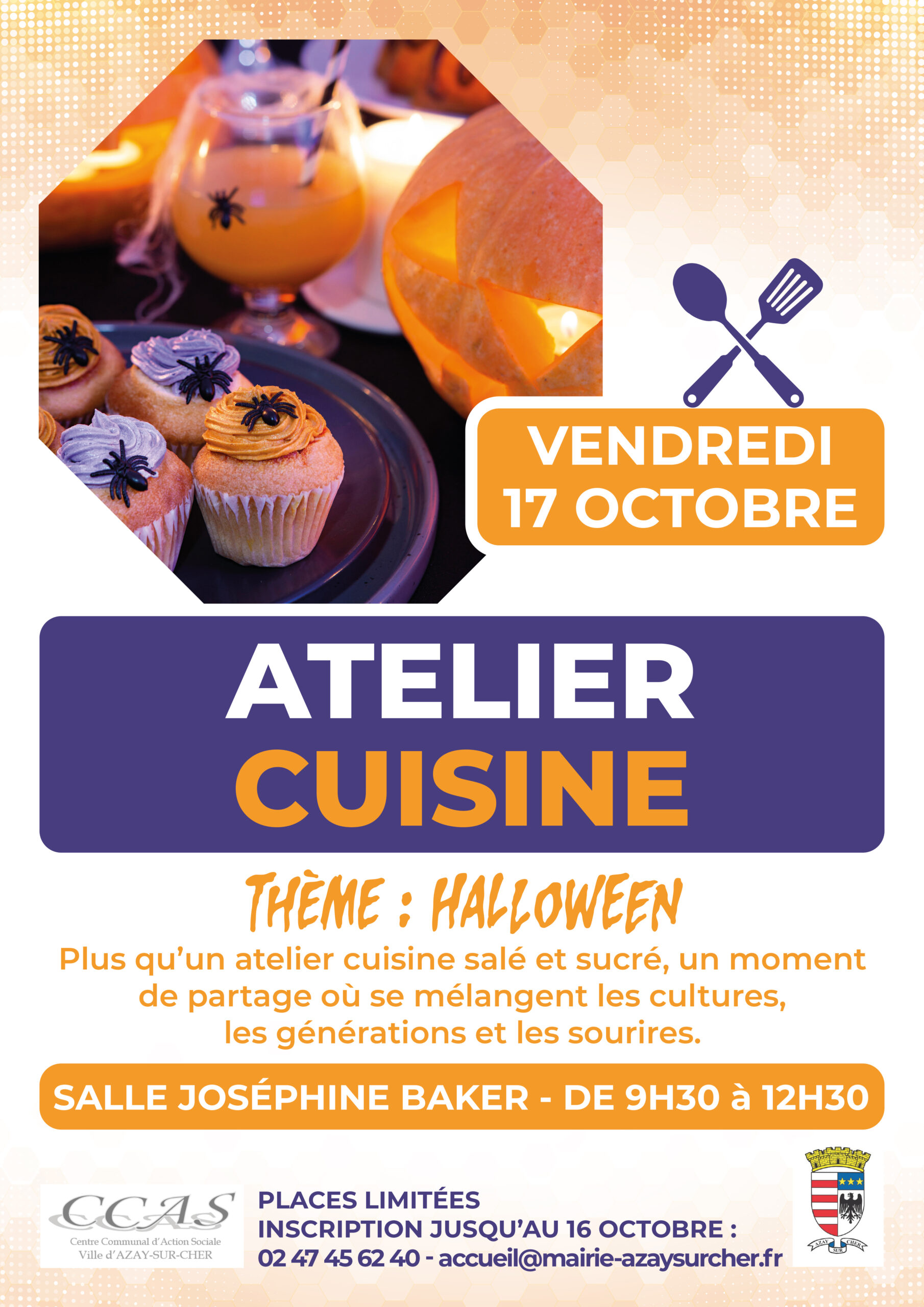 Le Centre communal d’action sociale (CCAS) d’Azay-sur-Cher vous invite à un atelier cuisine autour du thème Halloween, le vendredi 17 octobre, de 9h30 à 12h30, à la salle Joséphine Baker (6 rue de Plaisance).