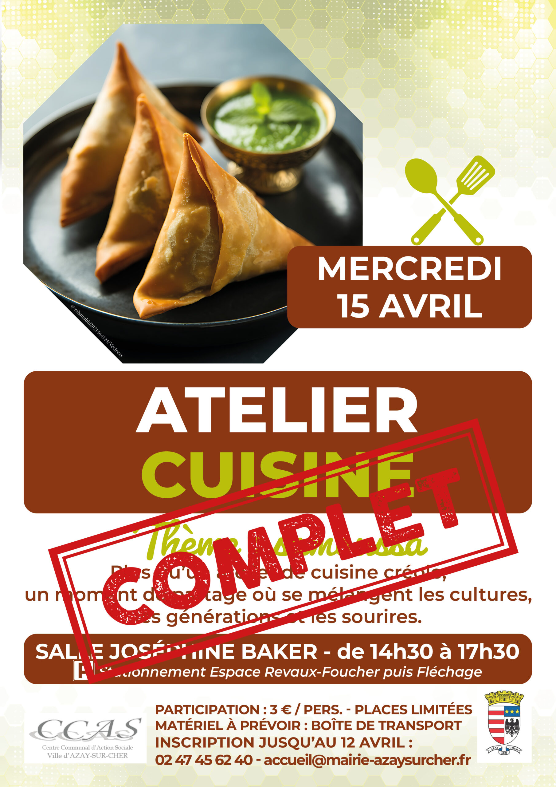 L’atelier cuisine « Thème Samoussa », organisé le mercredi 15 avril prochain par le Centre communal d’action sociale (CCAS) affiche désormais complet.