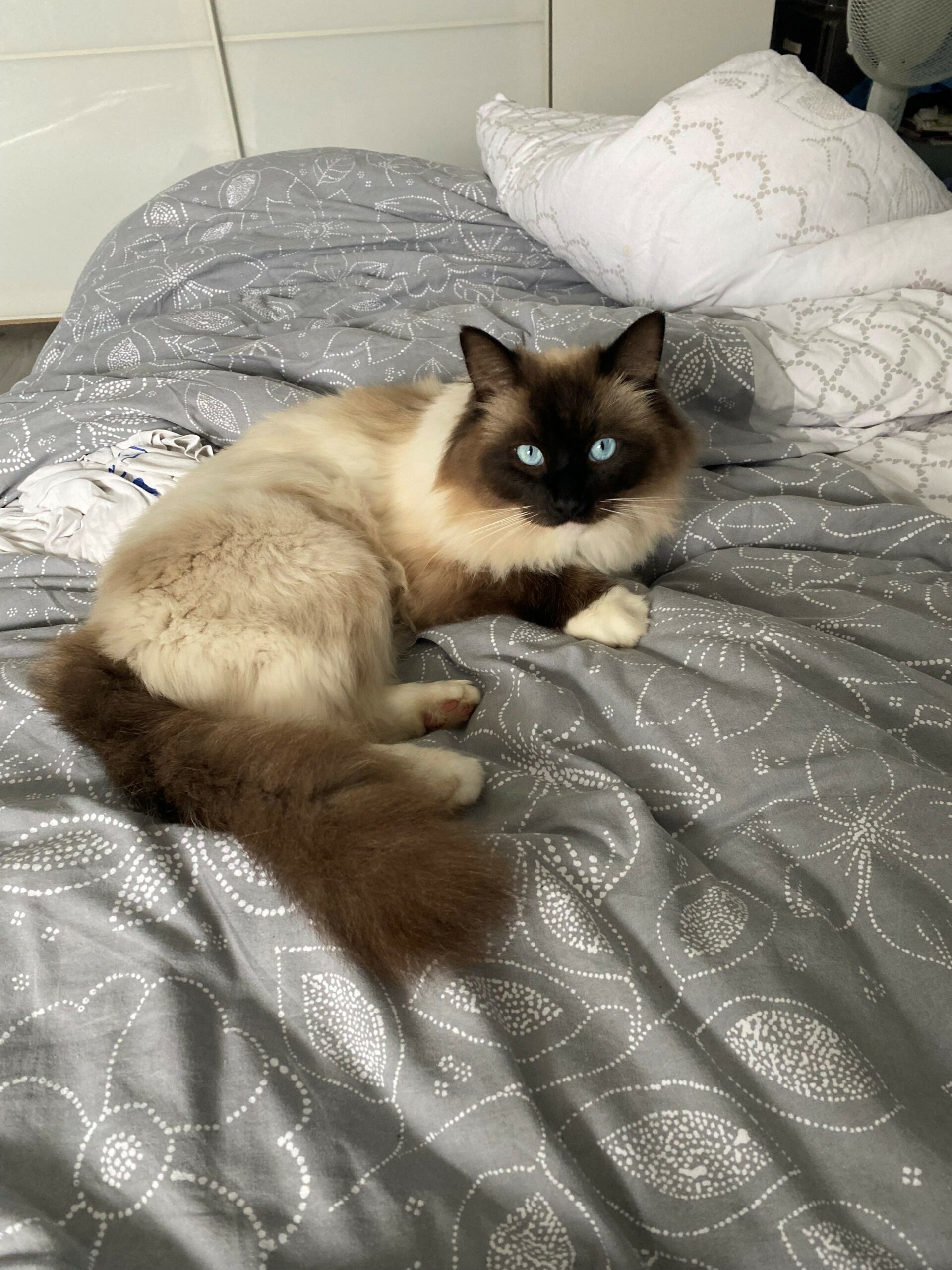 C’est un chat de 2 ans avec des grands yeux bleus et une fourrure cotonneuse.