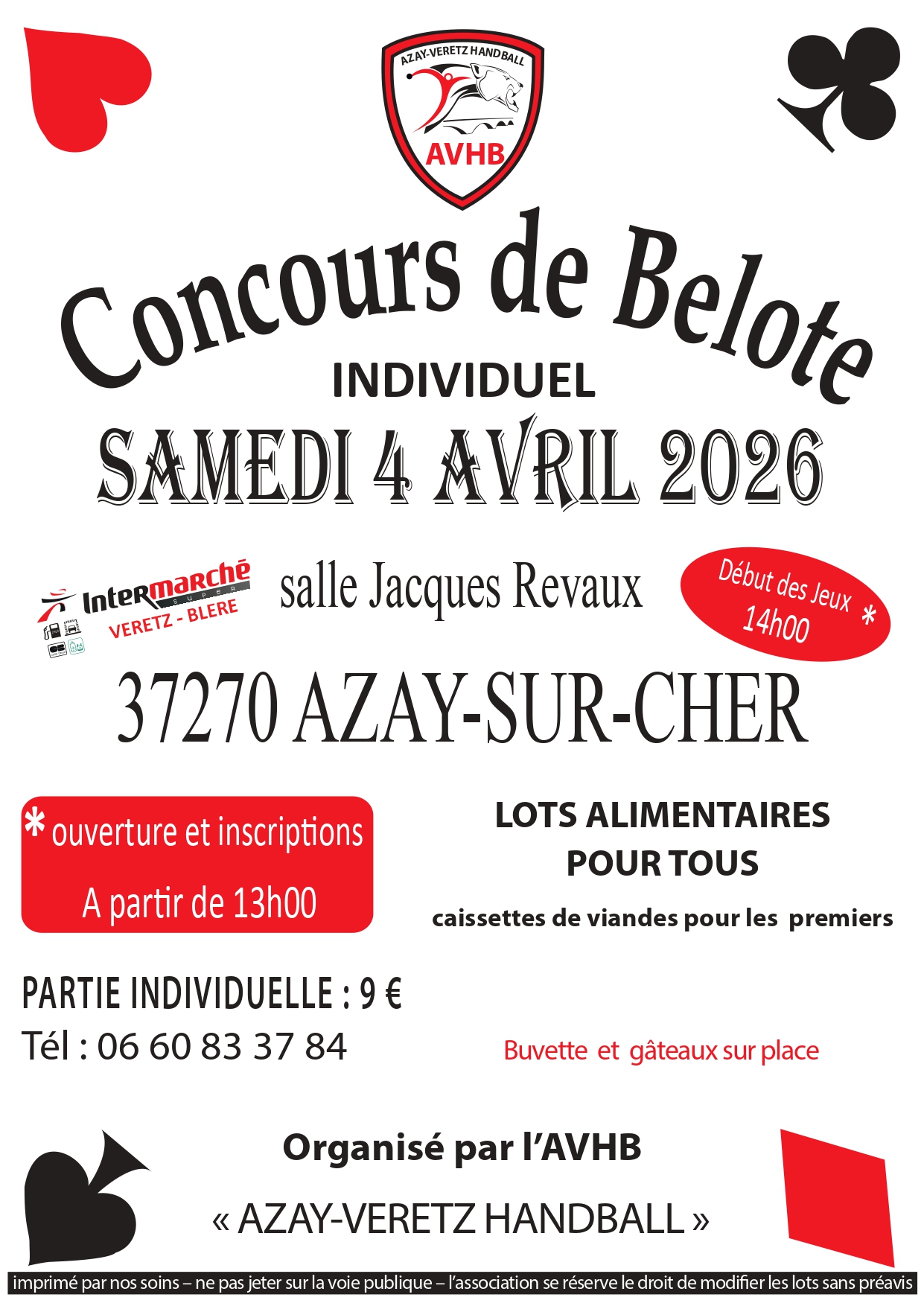 L’association Azay Véretz Handball (AVHB) organise son prochain concours de Belote le samedi 4 avril, salle Jacques Revaux.