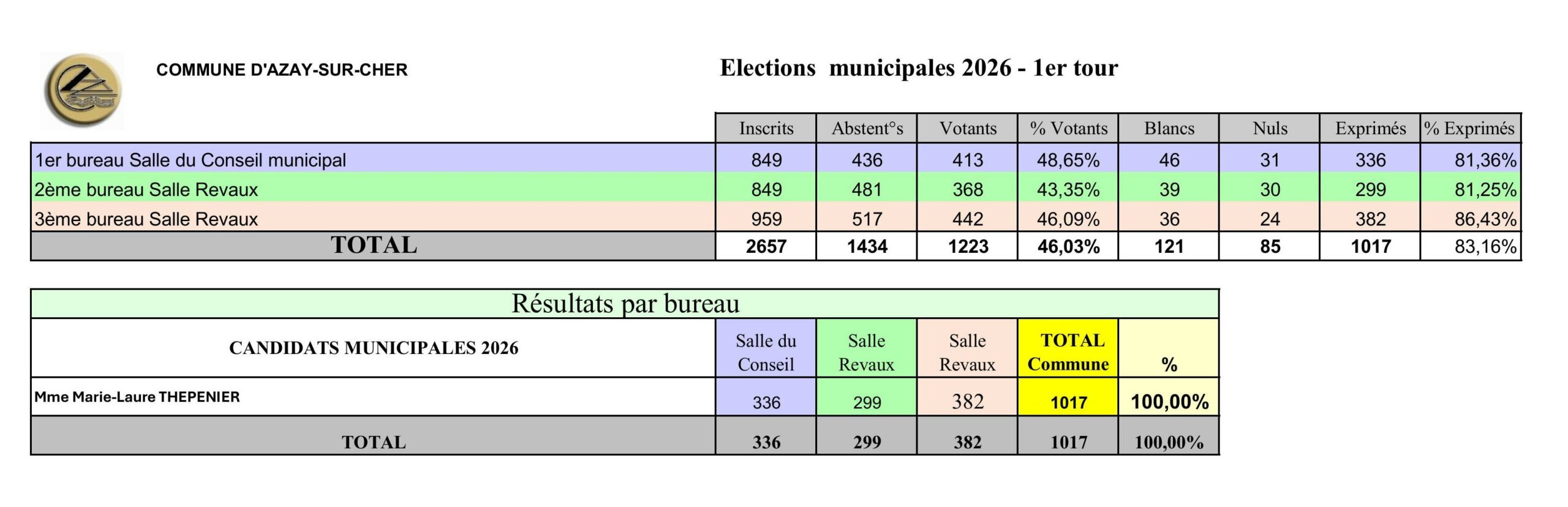Retrouvez les résultats du 1er tour des élections municipales pour la Commune d’Azay-sur-Cher : 2657 inscrits, 1223 votants, soit une participation de 46,03 %.