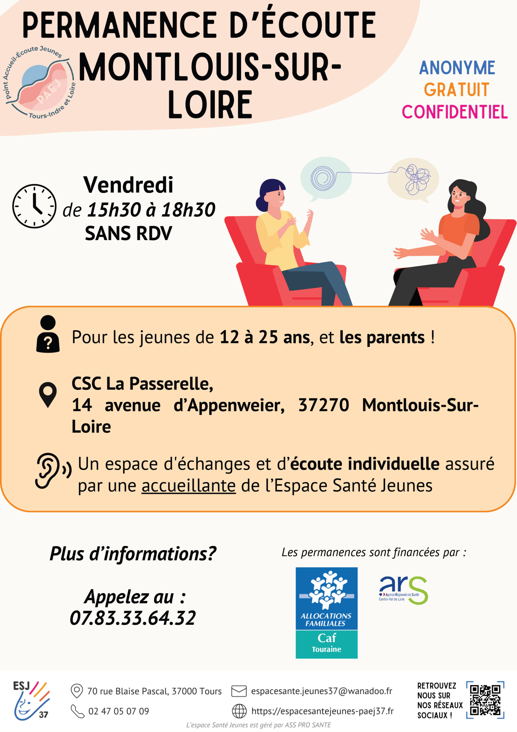 À partir du 9 janvier 2026, l’Espace Santé Jeunes 37 proposera des permanences d’écoute au CSC La Passerelle à Montlouis-sur-Loire chaque vendredi de 15h30 à 18h30.